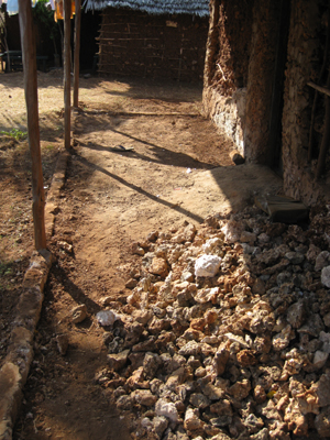Korallensteine werden im Fußboden des Hauses eingebaut um Vertiefungen auszugleichen. Anschließend wird ein Estrichboden eingebaut.