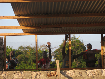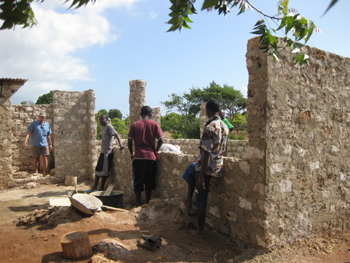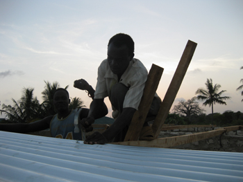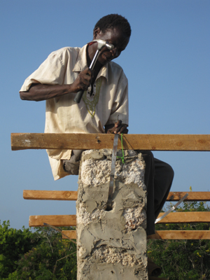 Handwerker Toja bei der Befestigung des Dachstuhls am Mauerwerk.