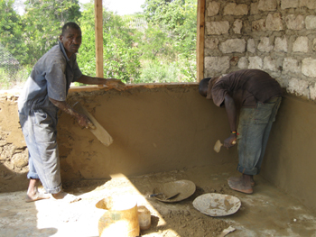 Handwerker Pascal und unser Freund Alex verputzen die Innenwände.