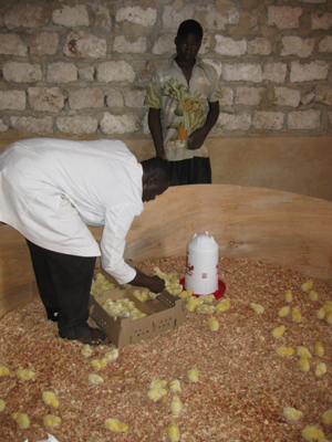 150 Stk. drei Wochen alte Küken ziehen in ihre neue Behausung.